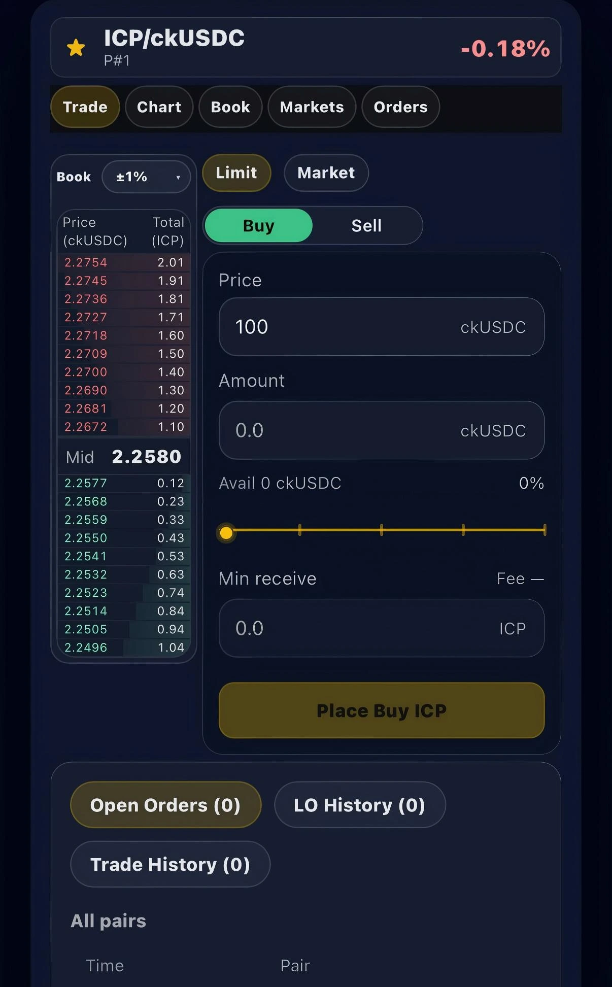 The trading surface is built around orderbook context, limit workflows, and partial fills, so execution feels closer to a real trading flow than a one-shot swap-first interface.